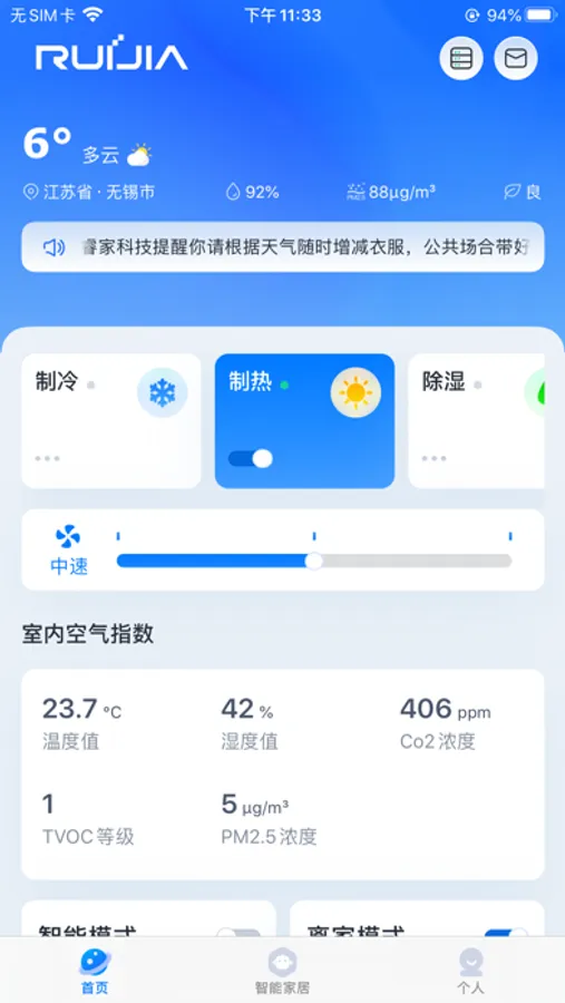 睿奥联App提供多恒系统一键快捷控制功能,实时跟踪住宅空气品质、能耗监控、各个房间温湿度以及常见智能家居设备控制。