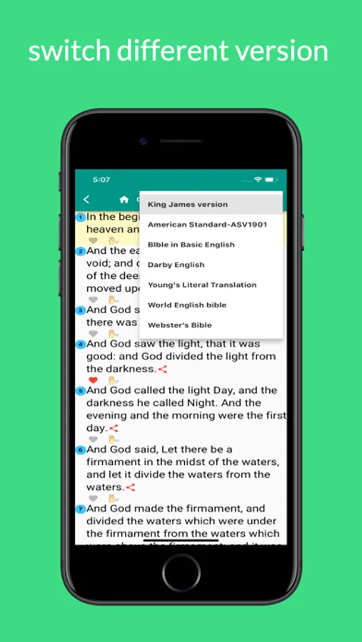 God's word holy bible is one of the best holy bible mobile application with multi version offline and audio support features completely free.The app is including 7 different bible version you can switch at any version offline. App included the most popular bible version. king james(kjv),American standard(ASV),Bible in basic english (BBE) Darby bible ,Young Literal Translation (YLT) Webster’s bible.The app is unique design and easy to read.You can redirect to specific verse using verse index it will automatically highlight your verse Also you can make your verse favorite.Share your favorite verse on social media with your friends and family read word’s of God .