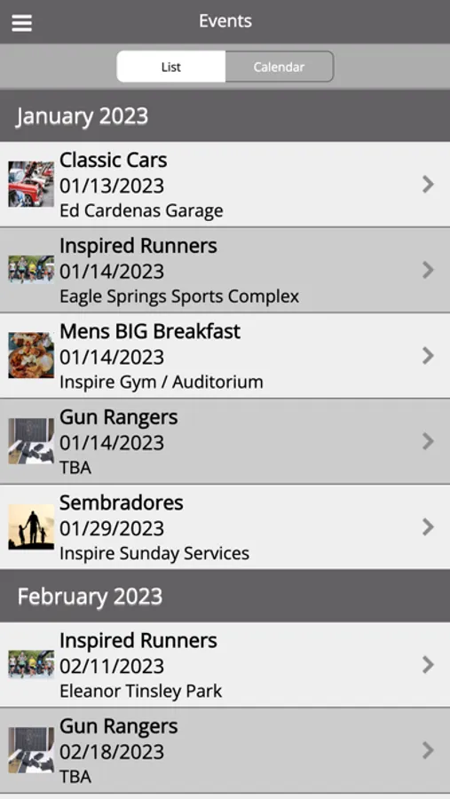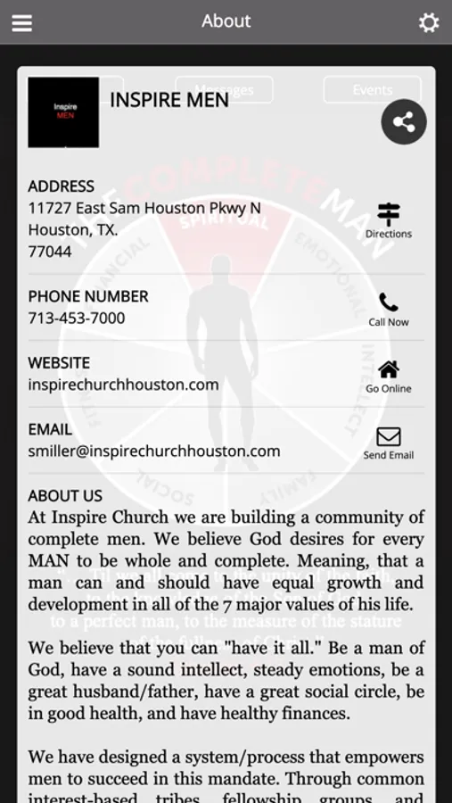 The Inspire MEN app is an interactive tool for the purpose of networking men into common-interest based fellowship groups called "tribes." This app features devotional videos, Inspire Church calendar, and inspirational content.