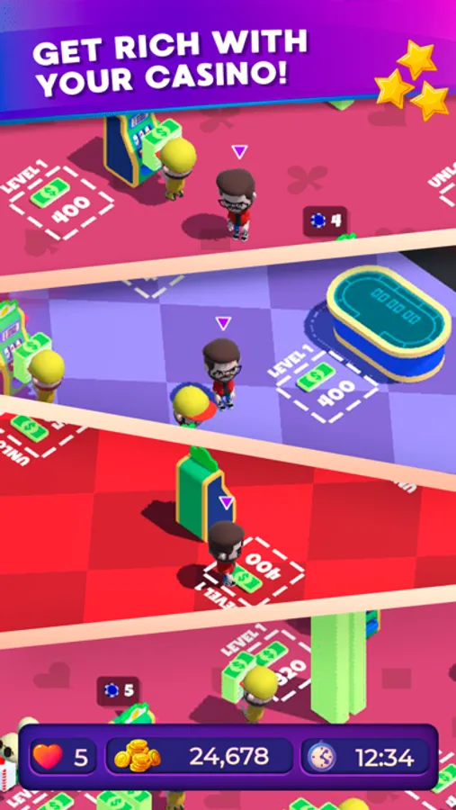 Experience beautiful 3D casino rooms! Manage your rooms to increase your idle income. Get idle cash at all times, even when you are offline. Profit from a smart venture to boost your economy.