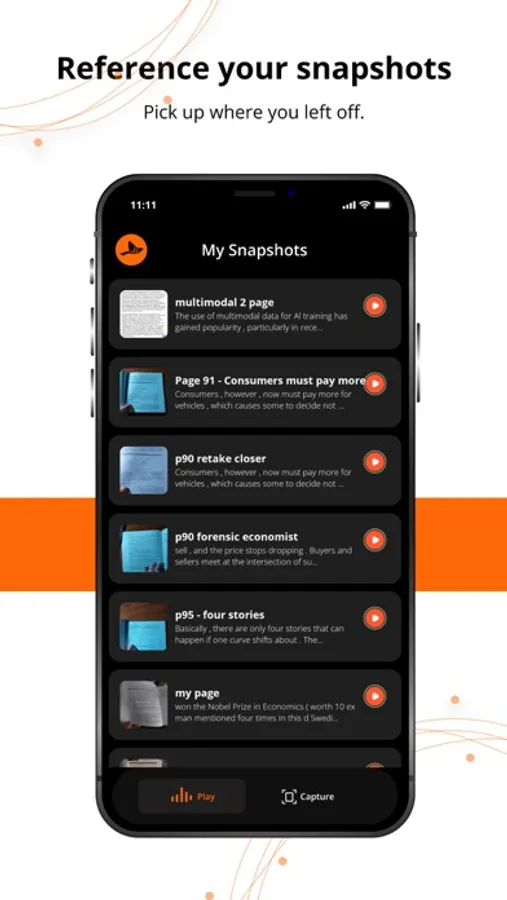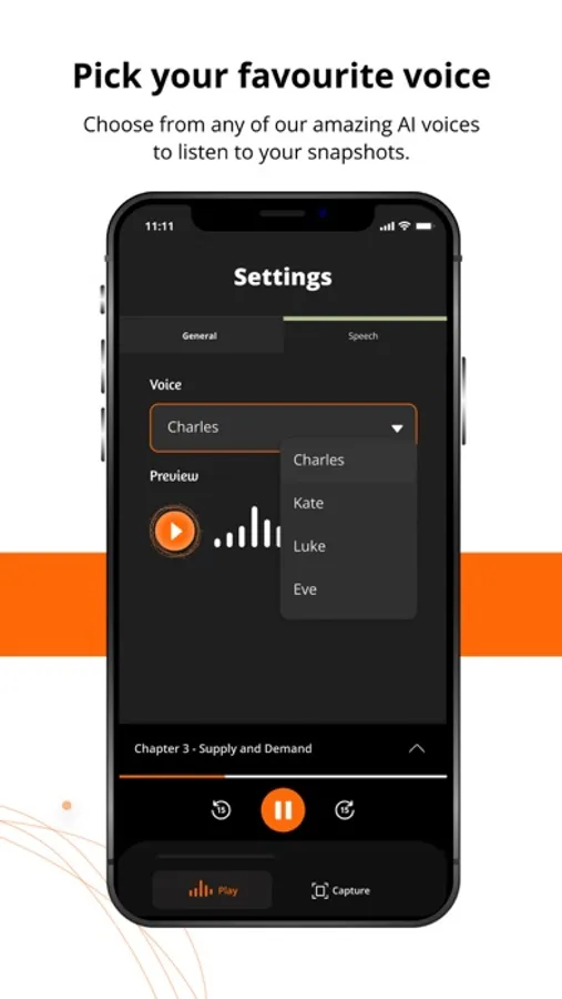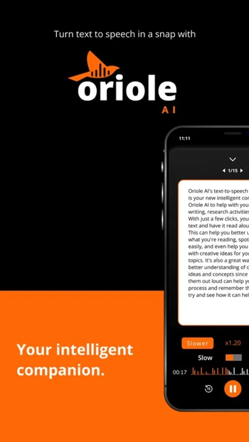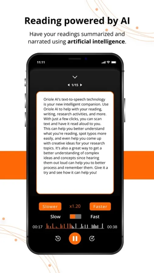 With Oriole, you can use the camera to capture text in any format to generate narration by state-of-the-art AI voices. Change the speed of the voice to your preference with intuitive speed controls that work for you, not against you, so that you can speed up or slow down at the exact right times.