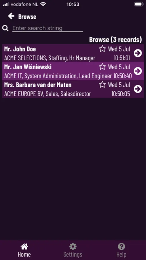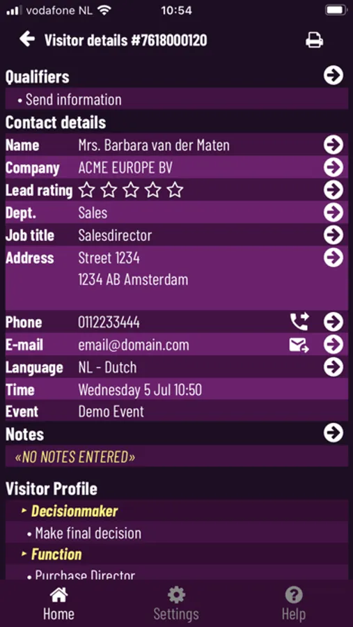 With the Leadscanner app you can scan visitor badges with your smartphone or tablet. For this purpose, all visitors' badges have a QR code printed on them. After scanning the QR code you can immediately view and alter all contact details of the visitor, but also add follow-up codes and your own notes.