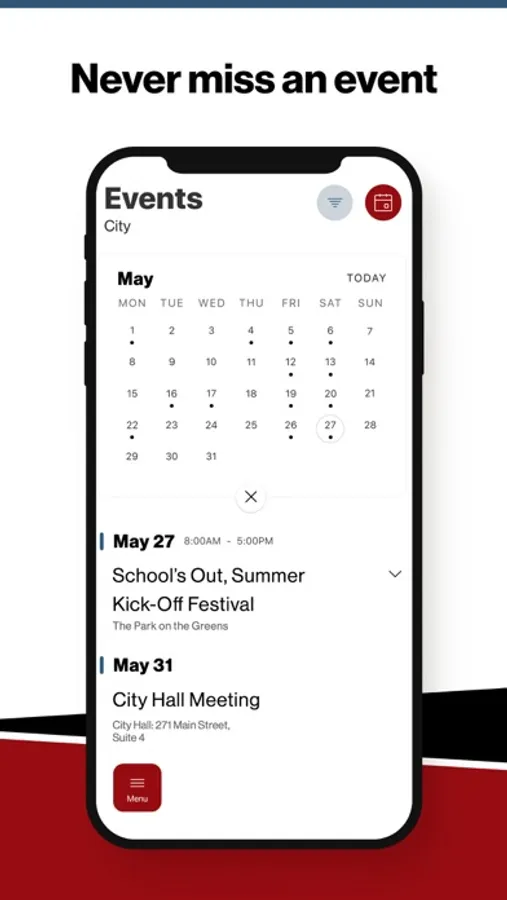 The event section shows a list of events throughout our community. Easily add an event to your own calendar and/or share the event with friends and family with one tap.