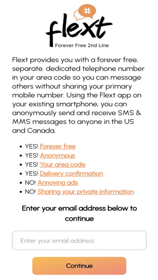 Flext is forever free as long as you use it sparingly. This is our contribution to the internet community. Need to make a quick text to a new friend but don't want to give them your number just yet? Want to sell something online but don’t want that person to have your number permanently? Want to get a confirmation text but aren’t sure you will use that service for very long? Flext is the perfect free solution.