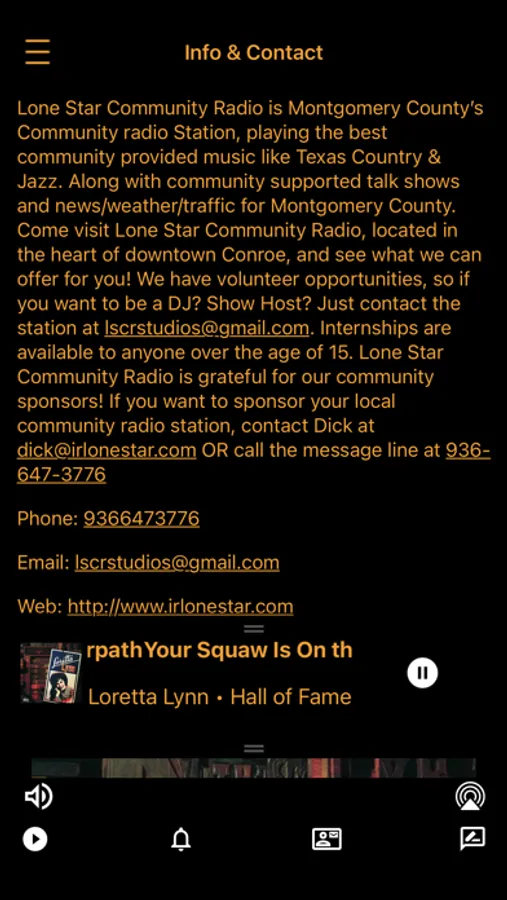 This APP will connect you to Lone Star Community Radio's LIVE stream! Lone Star Community Radio is Montgomery County's Community Radio Station! Featuring LIVE talk and music shows. More info can be found here: http://irlonestar.com/