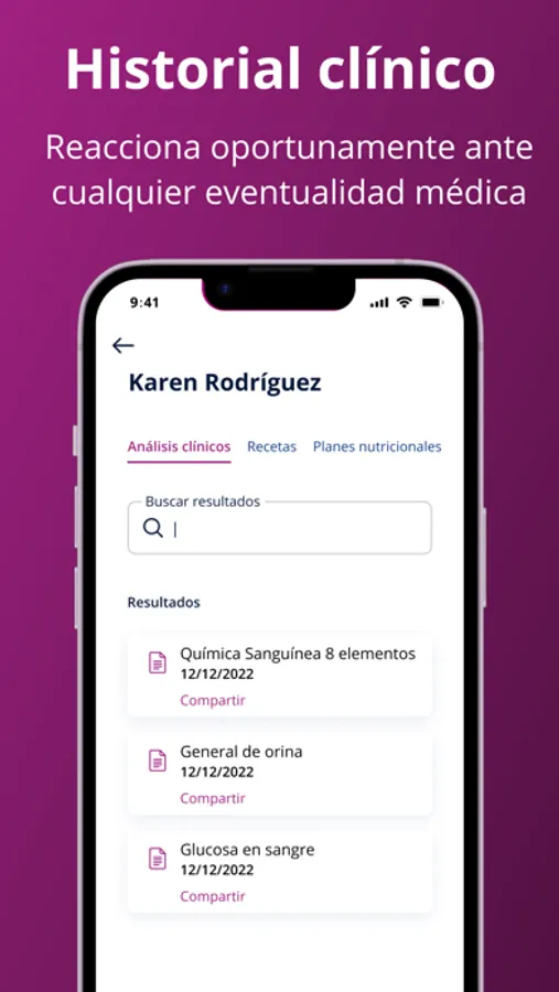 - Historial clínico con todos los resultados de las pruebas que les han realizado para que el médico tome mejores decisiones, o como evidencias ante aseguradoras.