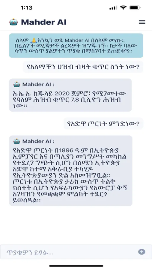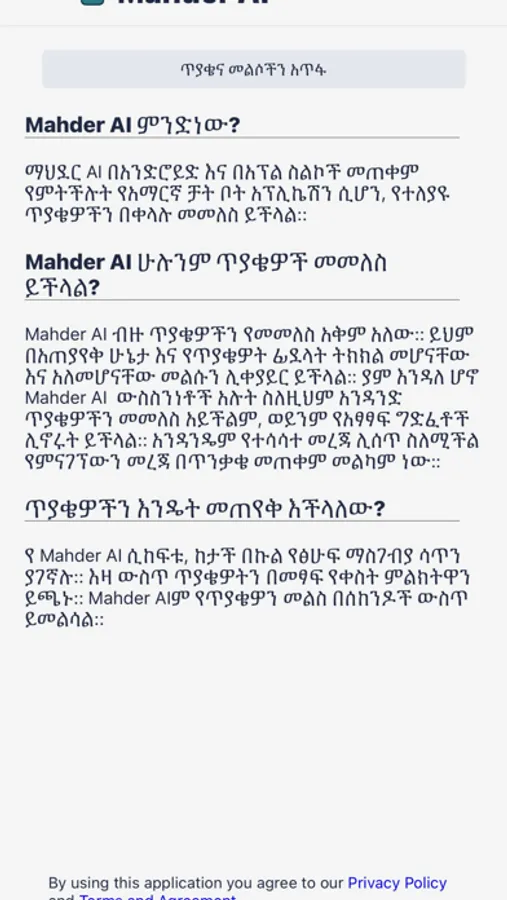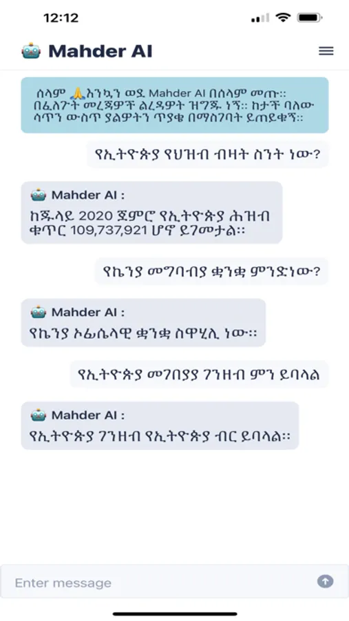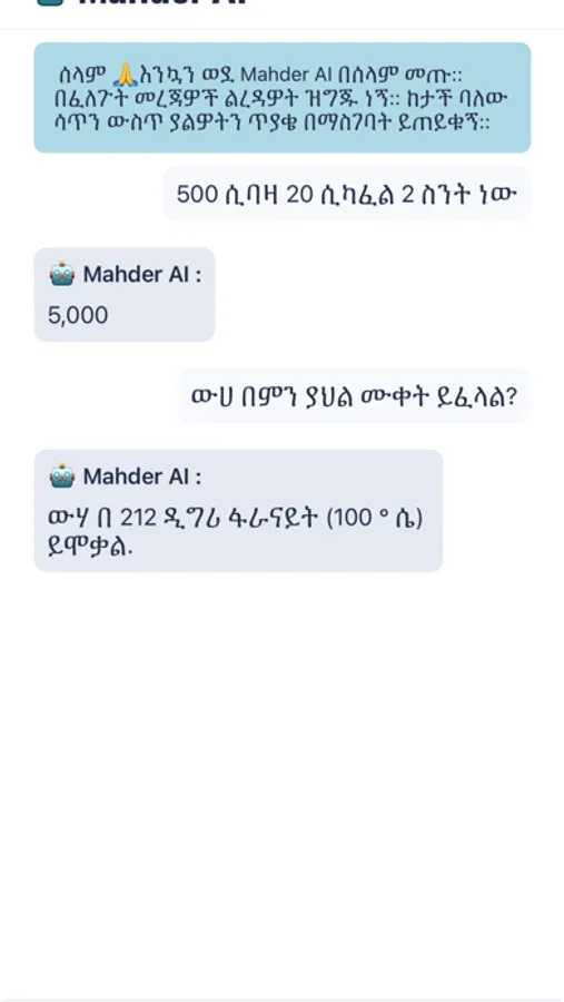 Mahder Al is the perfect AI chatbot for Amharic speakers! It uses advanced natural language processing techniques to understand and respond to user questions and commands in real-time, providing accurate and reliable information in the user's native language. With Mahder Al, Amharic speakers can easily access a wide range of information and communicate with others using their native language, no matter where they are. So why wait? Try Mahder Al today and experience the convenience and power of AI-powered communication in your own language!