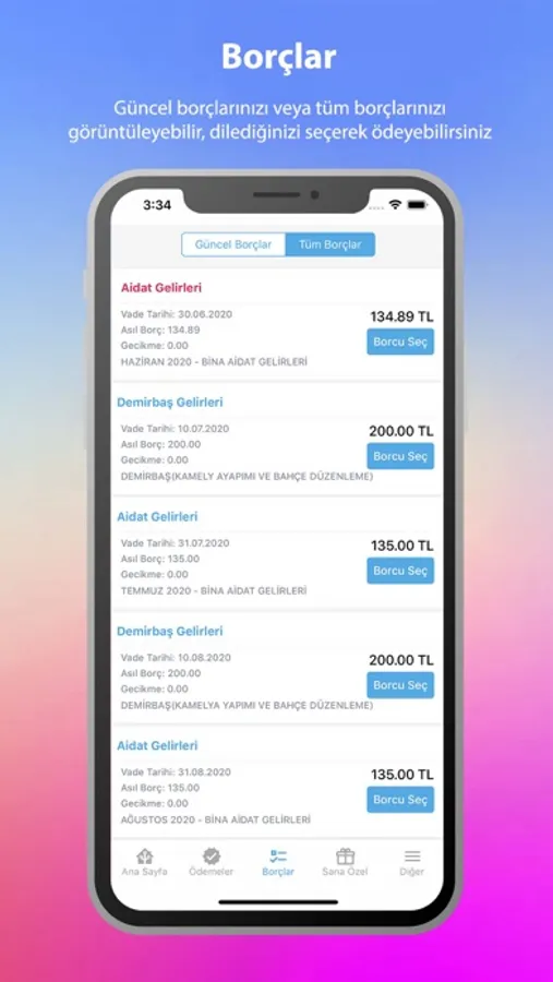 Borçlar sekmesinde güncel borçlar ve tüm borçlar olmak üzere 2 sekme bulunmaktadır. İçinde bulunduğunuz ödemeniz gereken borçlar güncel borçlar sekmesinde, carinize işlenen borçların tamamı iste tüm borçlar içinde bulunmaktadır. Dilerseniz güncel borçlardan dilerseniz tüm borçlardan seçim yaparak kredi kartınızla ödeme gerçekleştirebilirsiniz.