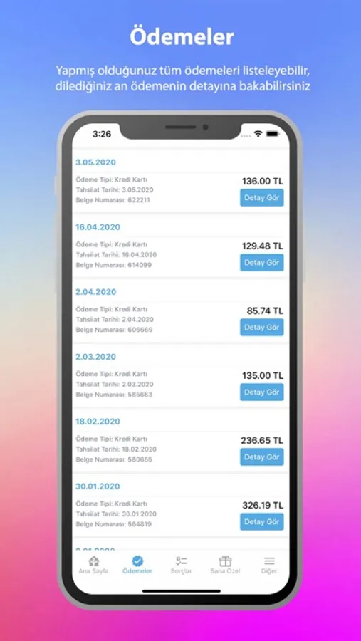Ödemeler sekmesinde bugüne kadar yapmış olduğunuz tüm ödemelere ve detayına ulaşabilirsiniz.