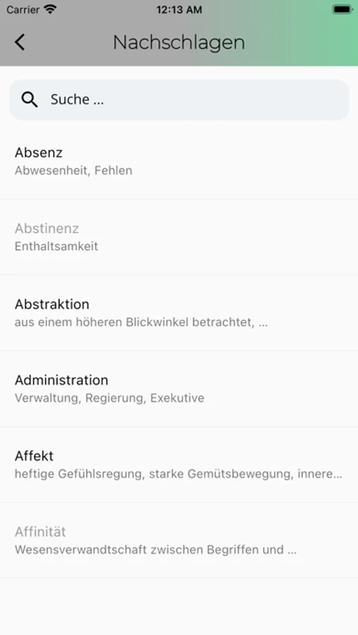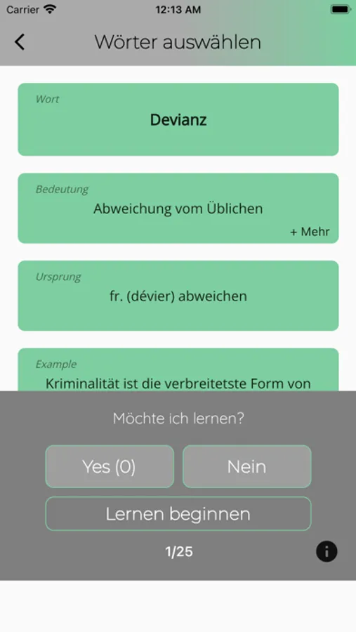 In verschiedenen Lernmodi können sich die Wörter spielerisch angeeignet werden. Des Weiteren eignet sich die App zum Nachschlagen von Wörtern.