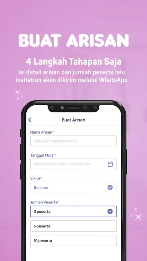 Untuk mengikuti arisan, kamu bisa mengajak peserta lain dengan total jumlah peserta 3, 5 atau 10 (termasuk Penanggung Jawab). Cukup pilih barang yang ada di katalog dan kamu sudah dapat langsung menjalani arisan online dengan teman maupun keluarga.