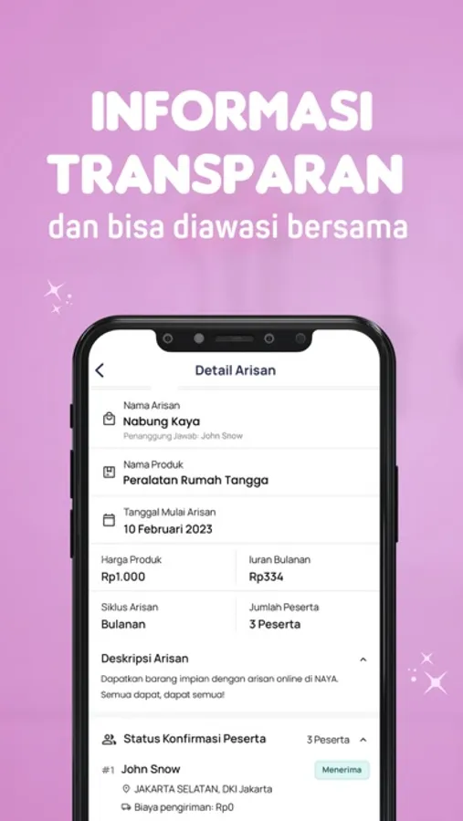 Bagaimana dengan pembayaran? Tak perlu khawatir, kamu dapat langsung membayar iuran arisan di aplikasi Arisan NAYA yang ditampilkan secara transparan.