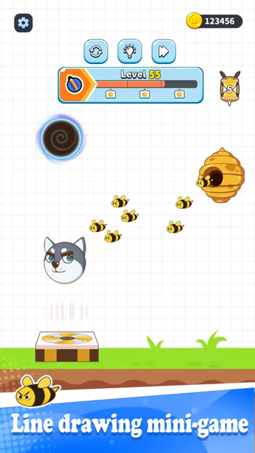 You draw a line with your finger to form a wall that protects the dog from the bees in the hive. During the bee attack, you need to draw to save the dog with the painted wall for 10 seconds, hold on and you will win the game. Use your brain to save the dog.
