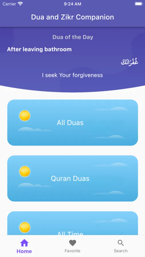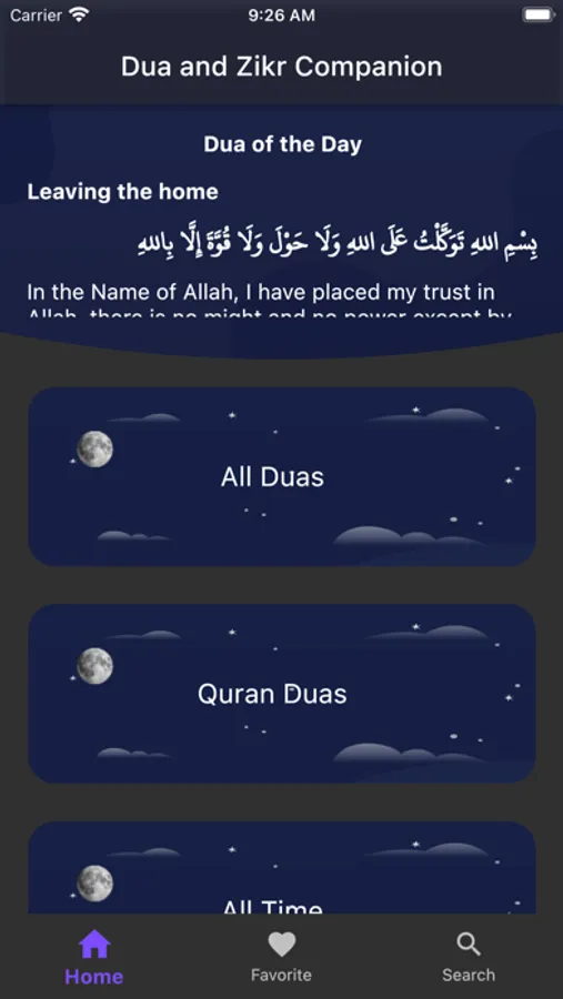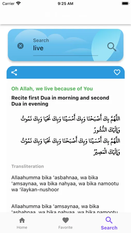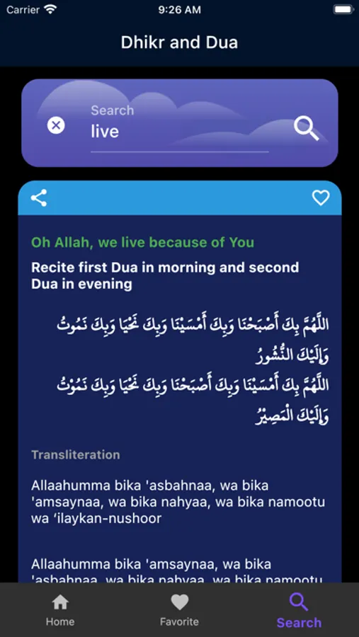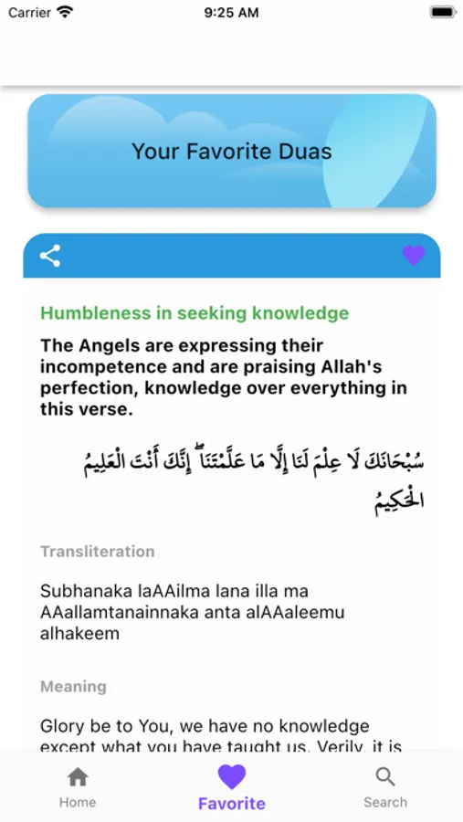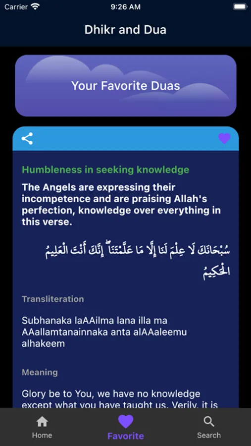 • You can share any Dua to any social platform or massaging app. The receiver gets a text containing the Arabic verse, translation and explanation of the Dua