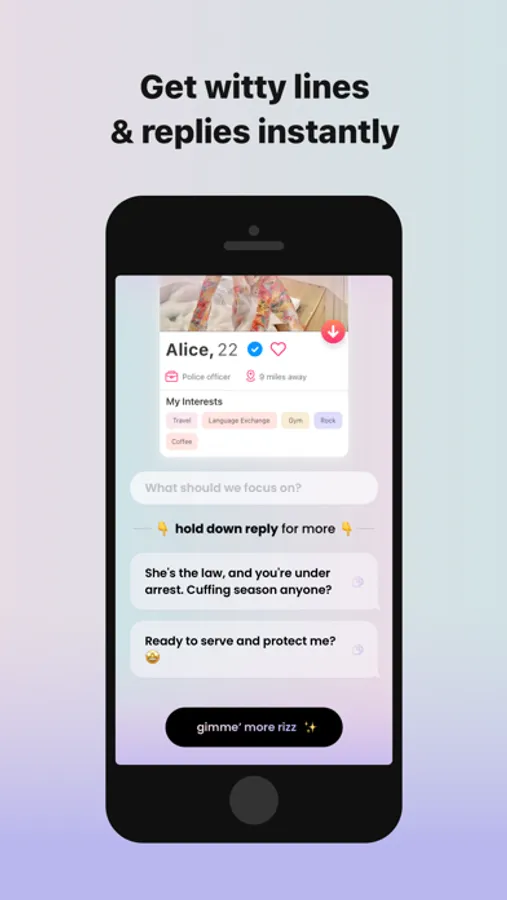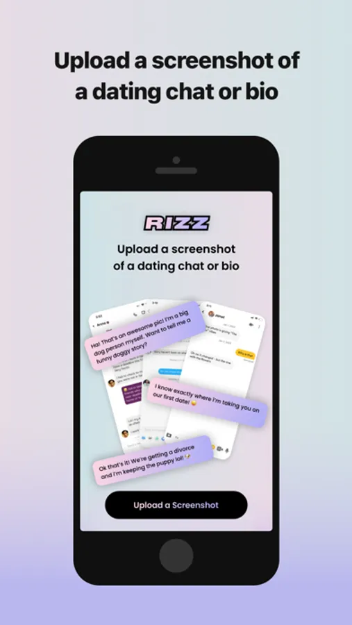 With RIZZ, you can upload screenshots of your conversations with your matches, and even your matches' bio, and receive instant and witty replies tailored to your unique situation. Our app is designed to help you keep the conversation going, whether you're trying to make a great first impression, impress your date, or simply want to spice up a chat.