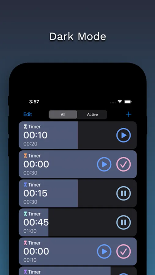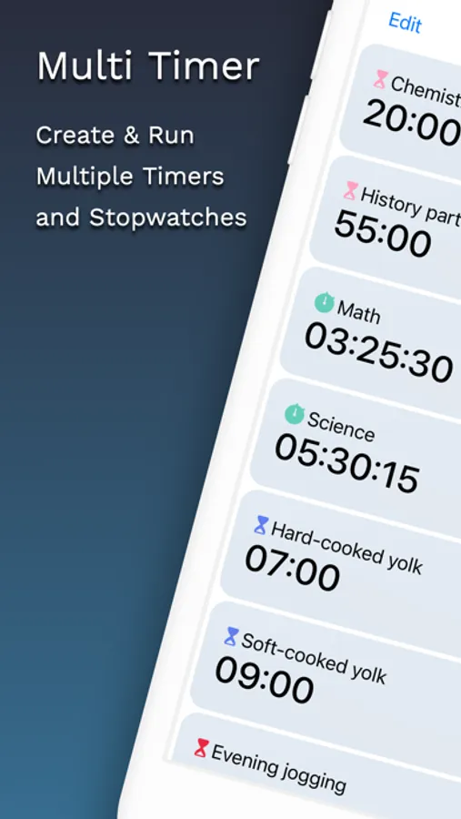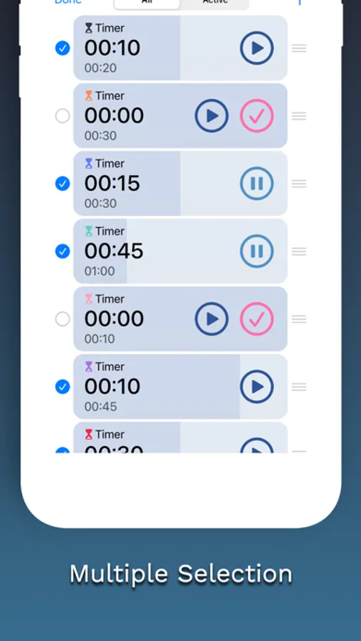 • Multiple selections allow multiple timers and stopwatches to be operated and deleted.
