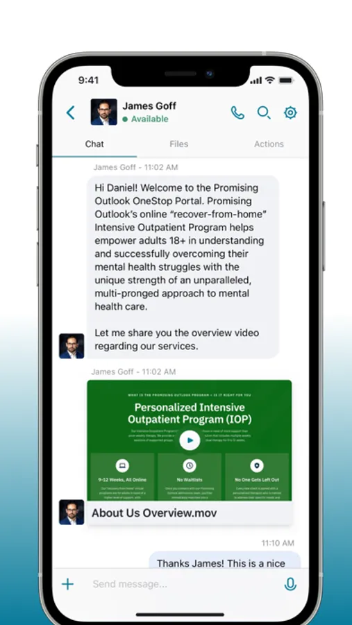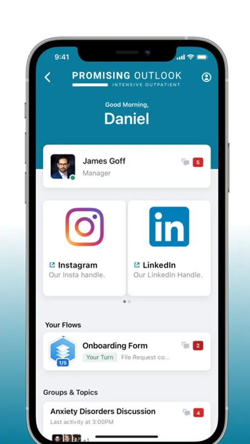 The Promising Outlook App is your space to connect with our team and review your treatment plan within a safe digital environment. Use the app to access your information, send secure chat messages, schedule virtual meetings, share & e-sign documents, and more.