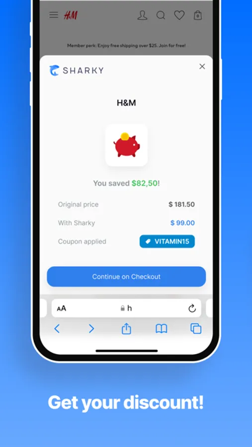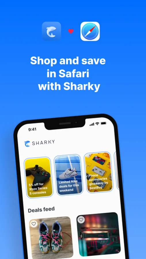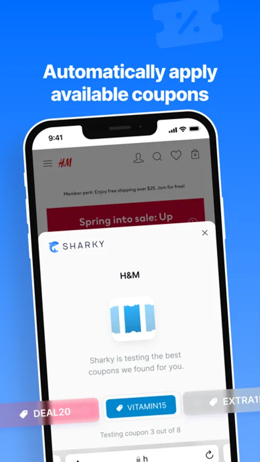 Smart assistant Sharky never wastes your time, so you can waste it somewhere else. When the app is installed on your smartphone, Sharky automatically explores all available coupons for the stores opened in Safari. The detected coupons are applied at the checkout until the best one is found.