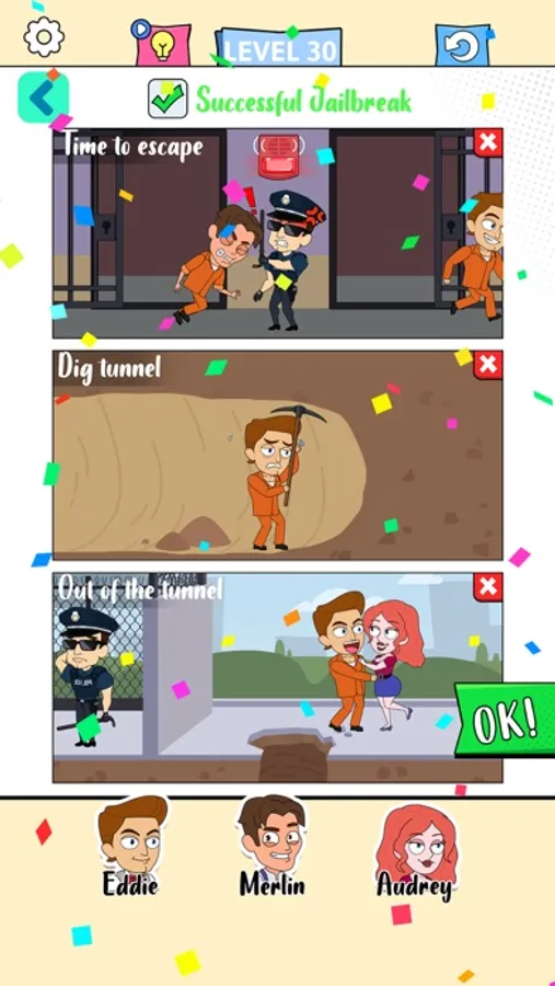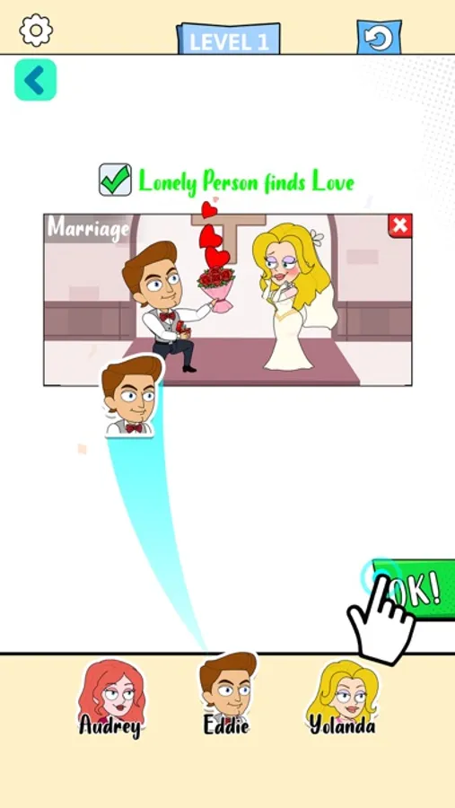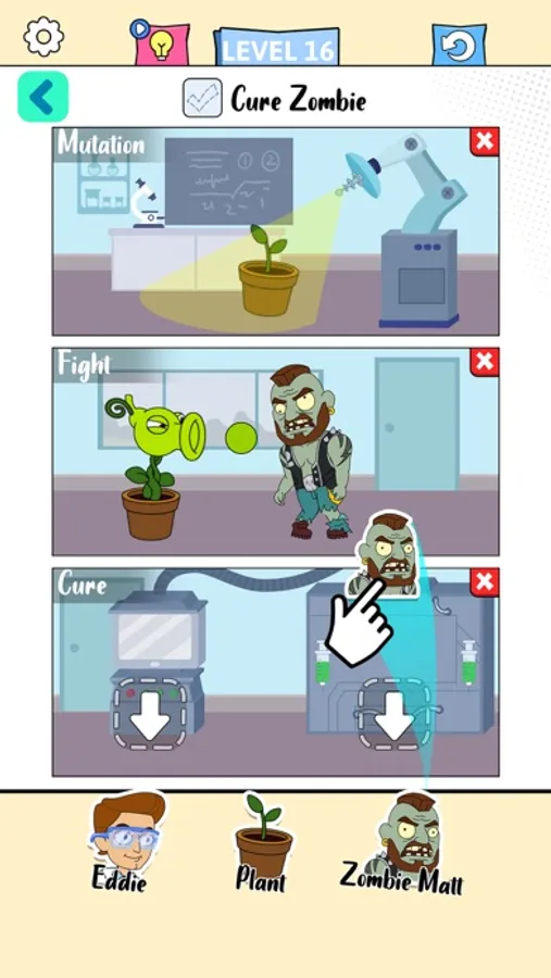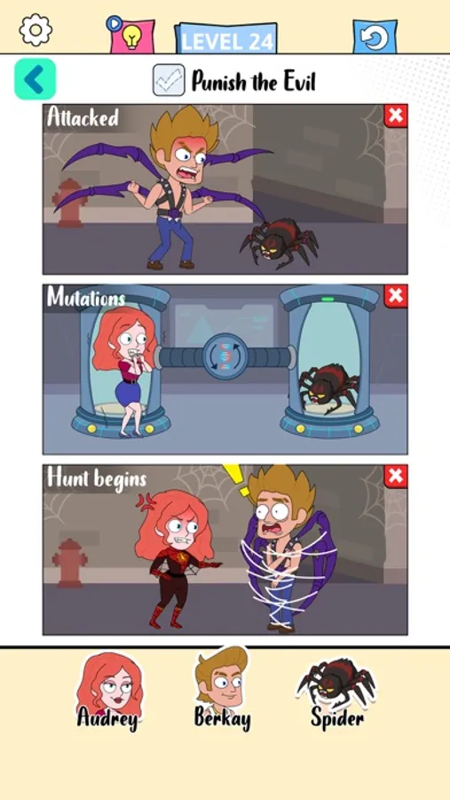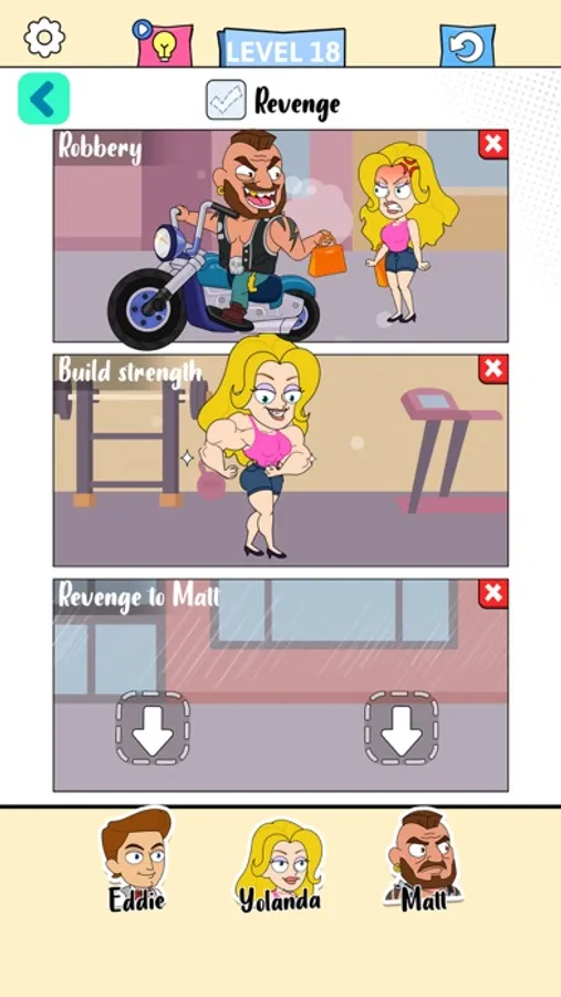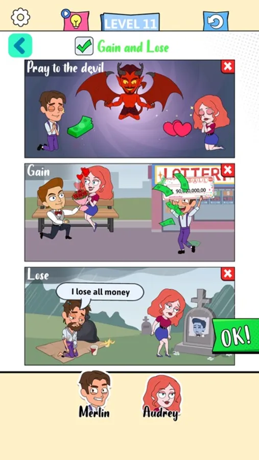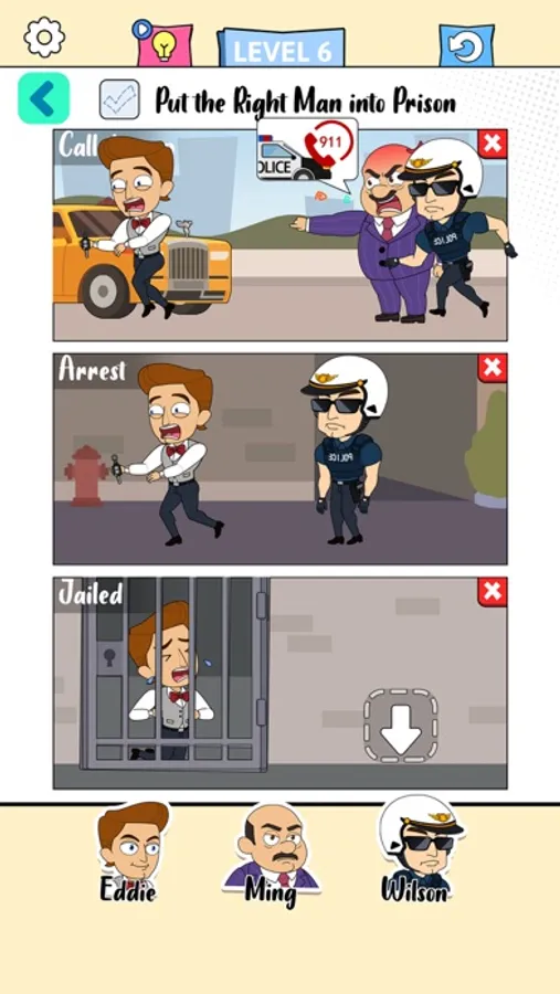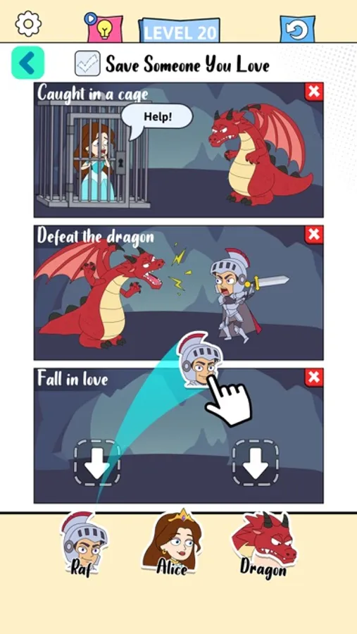 According to the keywords in the scenes, pick the right characters to finish the story. If you got stuck, swapping the characters may be helpful.