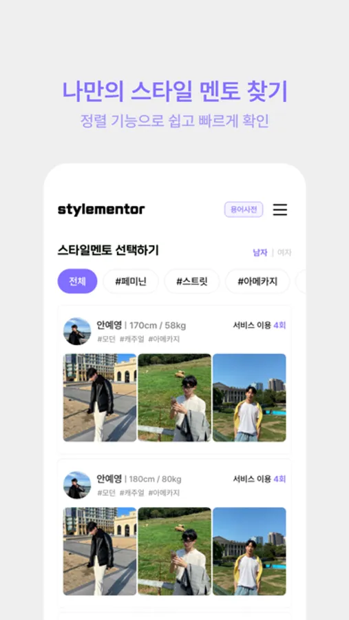 스타일 멘토들의 프로필을 보고 서비스를 받고 싶은 스타일 멘토를 선택해주세요. 스타일 멘토를 클릭하면 해당 멘토의 더욱 자세한 포트폴리오를 확인할 수 있어요!