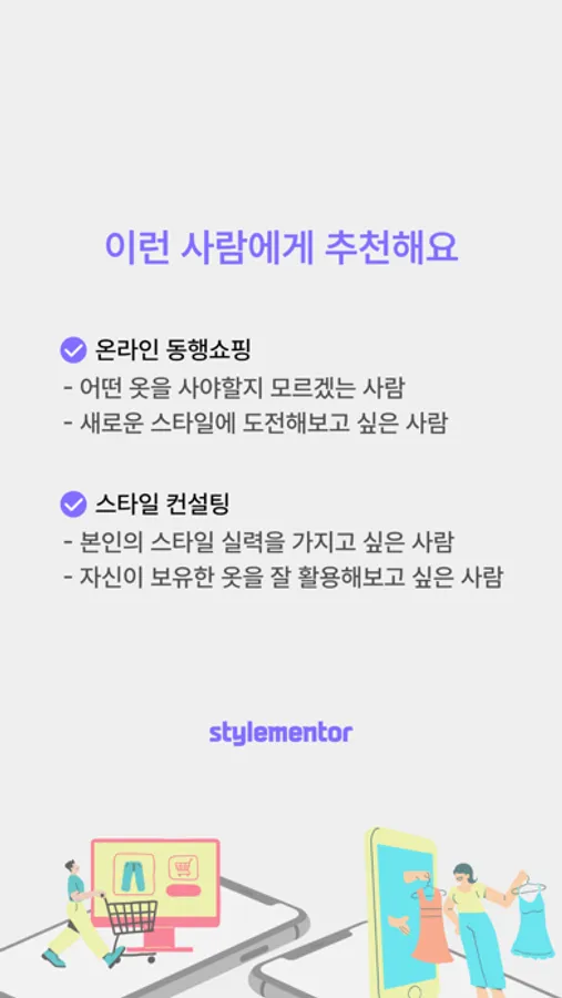 스타일 멘토를 선택하고 해당 멘토와 화상 대면으로 함께 쇼핑 사이트를 둘러보며 이용자에게 최적의 제품(이용자의 신체 사이즈, 취향, 상황, 예산 등을 고려한 제품)을 추천합니다. 뿐만 아니라, 제품의 사이즈(핏)와 색상 선택까지 도움을 제공하며 제품이 장바구니에 담기는 순간까지 함께해요!