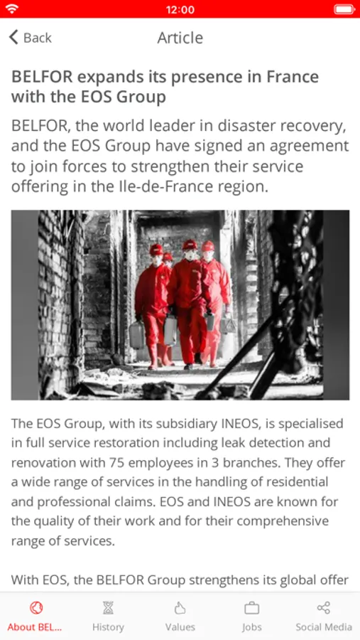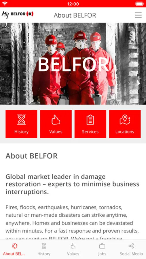 The app provides insights into the world of damage restoration at BELFOR - mobile, fast and up-to-date. It constantly offers new information about the company and its services. It is supplemented by an overview of our locations worldwide and an insight into our history. All this is available in the MyBELFOR app!