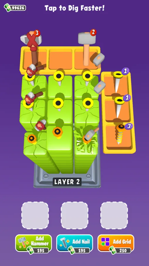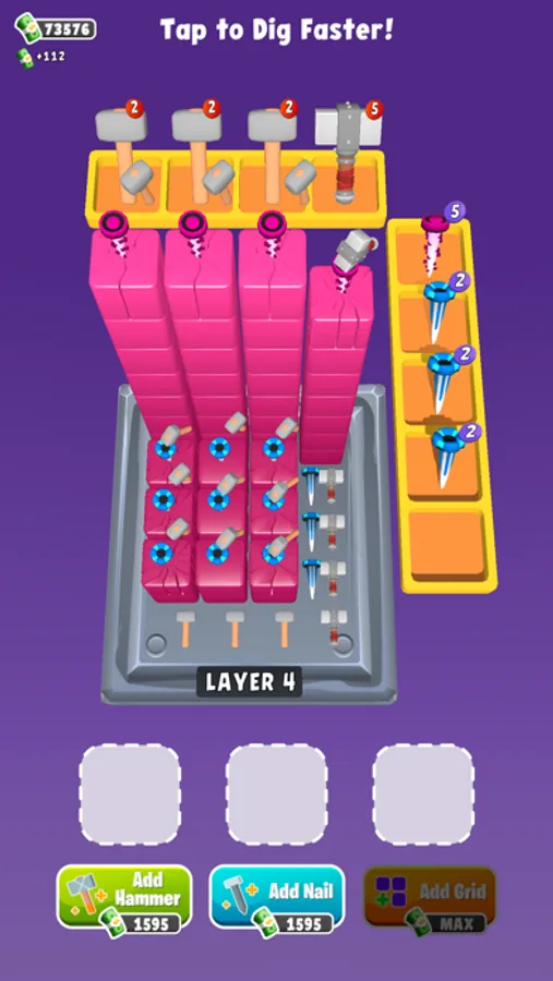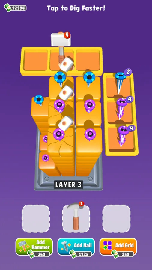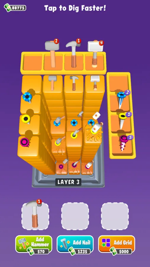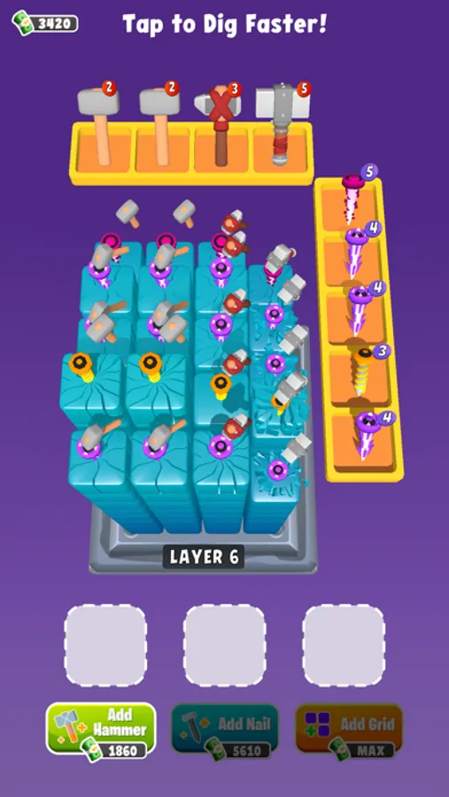 Merge nails and hammers to obtain stronger nails and hammers. Destroy the layers by using them.