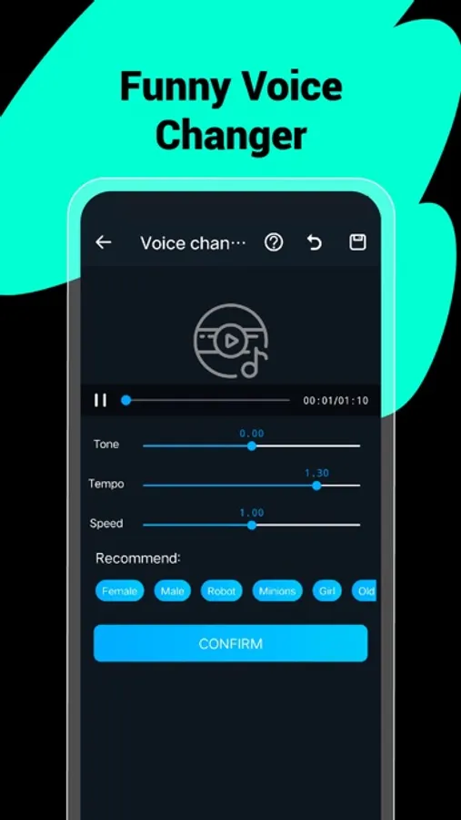 · Change your voice to male voice, elderly voice, robot voice, etc.