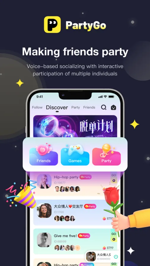 Welcome to Party Go, space where you can let loose and meet new friends from all over the world.Are you ready?