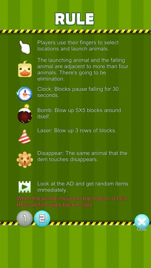 1: There are 2 kinds of animals at the beginning of the game. After a certain period of time, the whole line will fall down. When any line of animals falls to the bottom, it will be gameover.