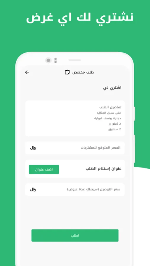 خدمة اشتري لي: خدمة الشراء تتيح لك إدخال الأغراض التي تريد شرائها سواءً من مطعم ، بقالة ، سوق .. الخ ، وستصلك بأسرع وقت.