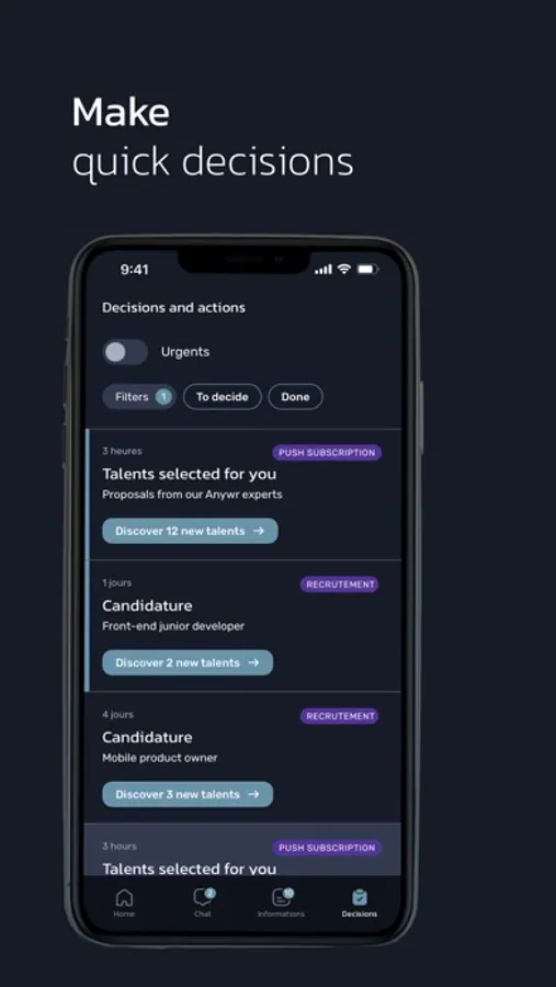 Decide is a scalable HR solution developed by Anywr, the European leader in international recruitment and professional mobility. Designed by HR experts for managers and HR professionals. Decide evolves at the pace of your business and responds to all HR decision-making issues.