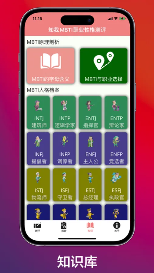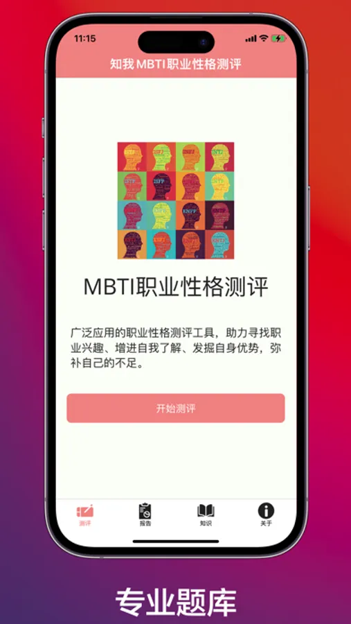 知我MBTI职业性格测评是一款心理测评应用,采用精细化的6选项专业题库,旨在帮助大家增进自我了解、发掘自身优势。