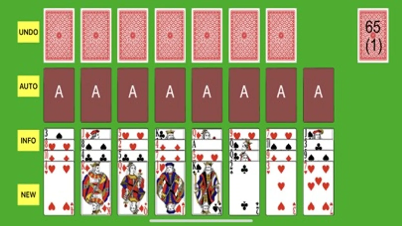 The central area on the left (2), with eight slots, is initially empty, and will be filled, as the game progresses, with eight homogeneous stacks, each with cards of the same suit, in ascending order, from Ace to King. Only the topmost card of the stack is visible.