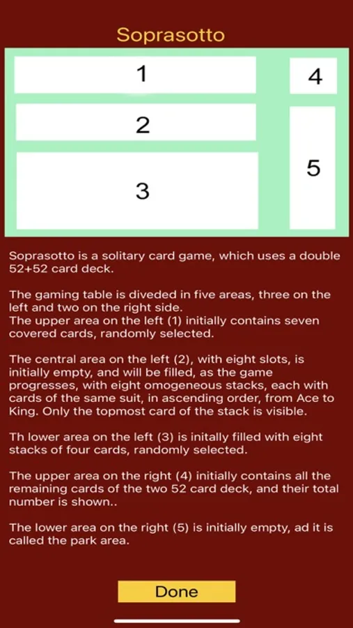 Soprasotto is a solitary card game, which uses a double 52+52 card deck.
