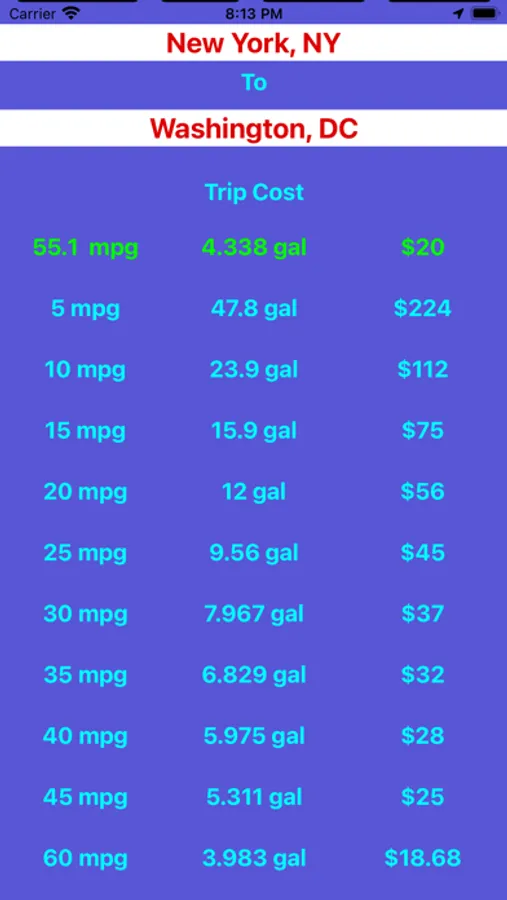 Just enter Fuel Price and Trip Distance to Calculate an entire Table of Trip Costs.