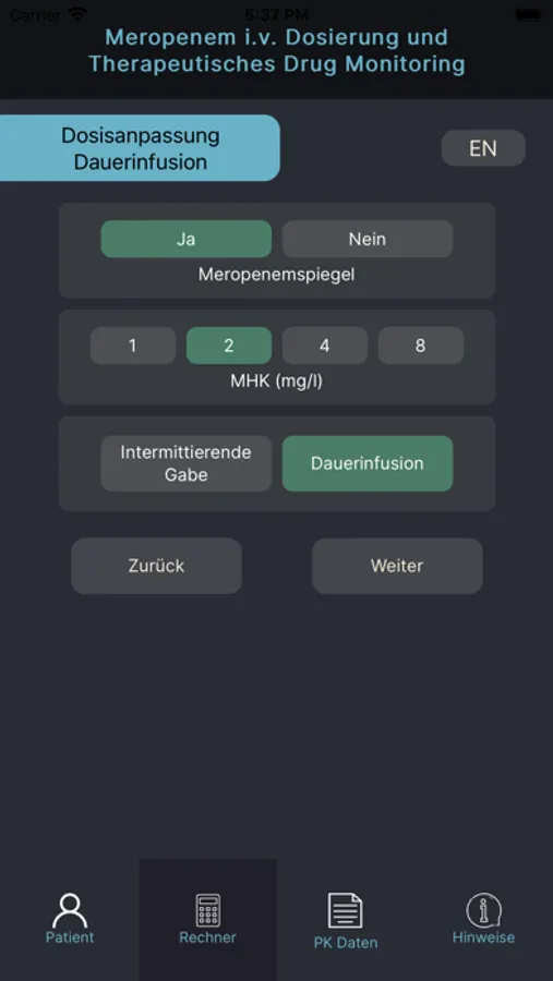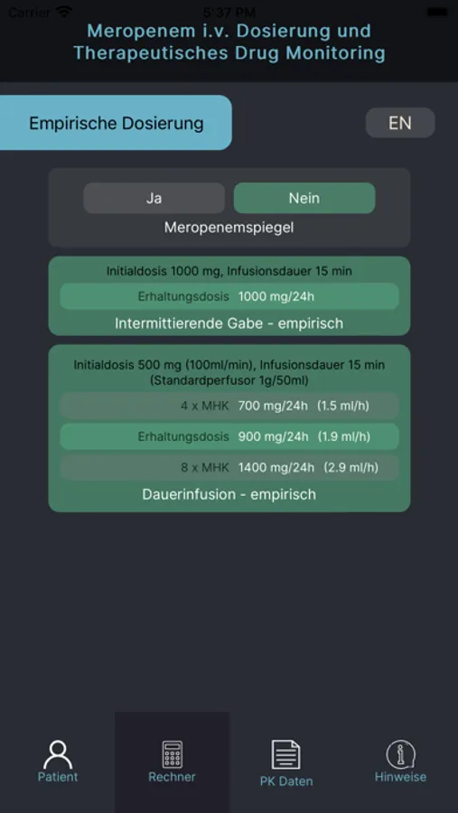 Berechnen Sie neue Meropenem-Dosierungen oder passen Sie bestehende Dosierungen an. Sie erhalten Dosisberechnungen unter Berücksichtigung der Meropenem-Spiegel für die intermittierende und die kontinuierliche Applikation. Entwickelt für die Ausbildung von medizinischem Fachpersonal zur Berechnung bei erwachsenen Patienten ohne Nierenersatztherapie um Einflüsse der Meropenem-Dosierung abzuschätzen und pharmakokinetische Formeln zu verstehen.