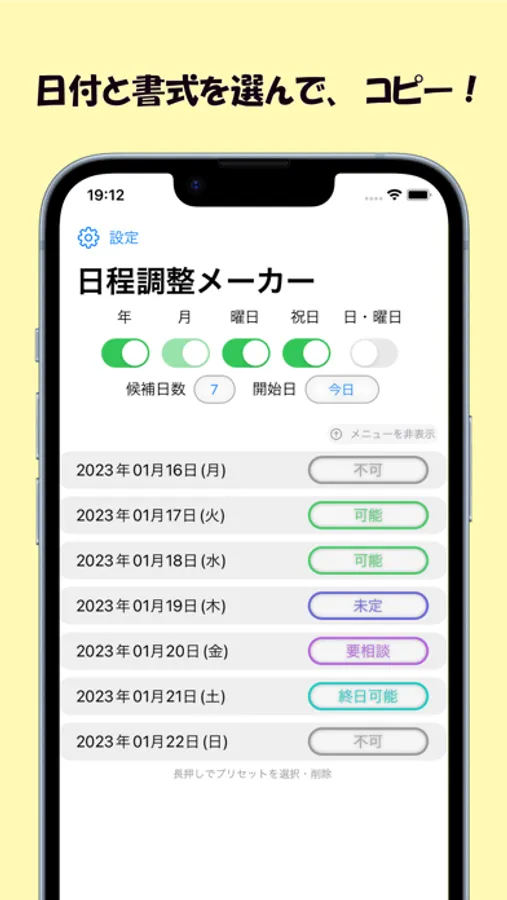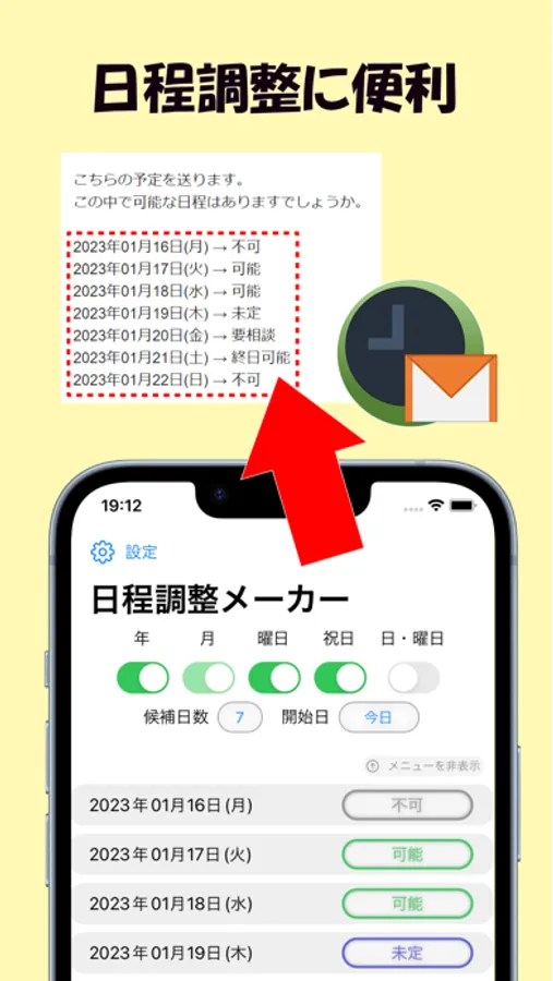 メール等での予定調整の際に、候補日を手軽に選択してコピー!メールにテキストを貼付出来ます。