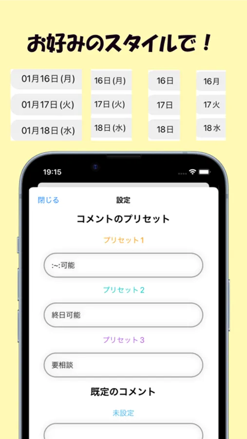 年月日と曜日・祝日、区切りを自由に変更できます。カスタム名称も使えます。