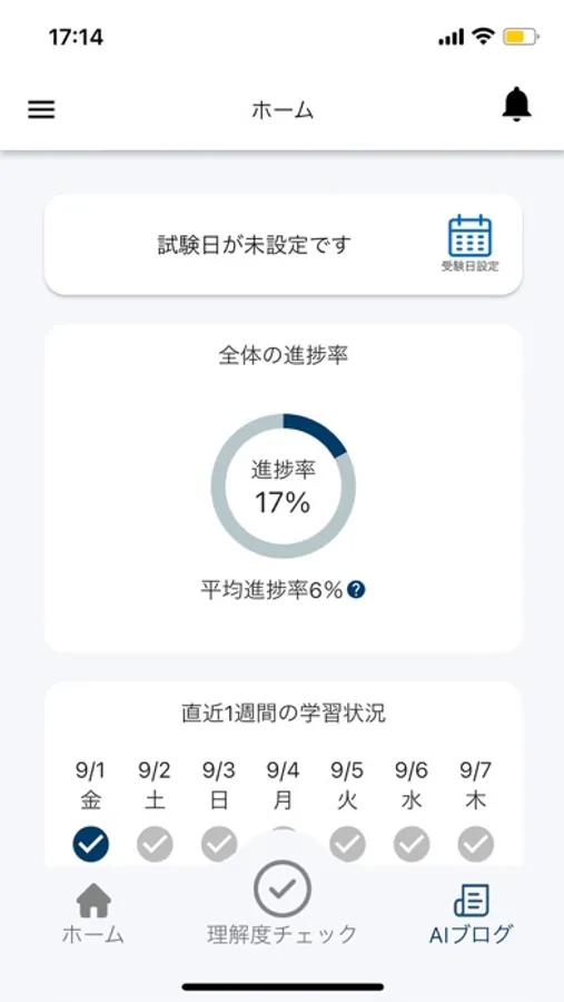 常に学習の進捗率が確認できます。現在の各カテゴリごとの進捗や学習状況、試験日までの学習ペースの目安などを可視化できるので、計画的に勉強を進めることが可能です。