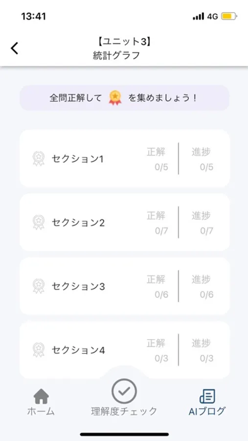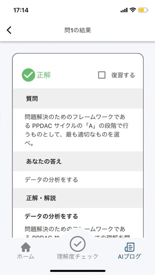 各カテゴリごとの理解度をチェックし、すぐに学習の穴を埋めることができます。全問正答するとバッチを獲得し、自身の頑張りが可視化され、間違えた問題は復習フラグがつき、いつでも復習が可能です。