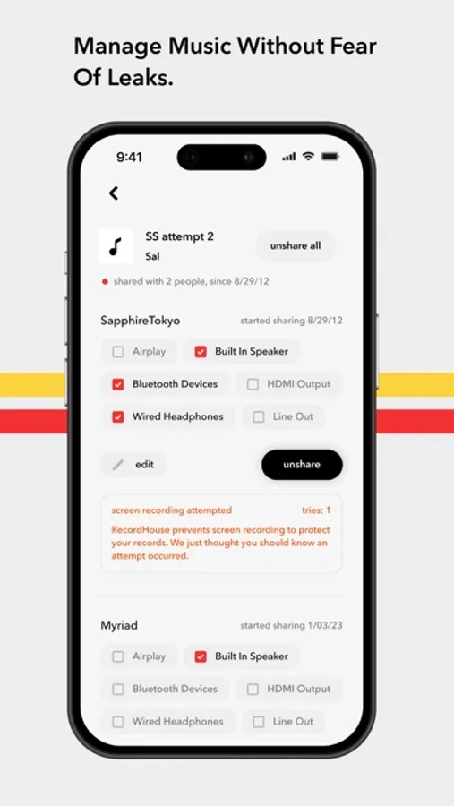 RecordHouse is a passion project I started in search of a clean, simple offline music player. I found existing options to be complicated and ridden with paywalls so I decided to make a simple free solution for anyone looking for a place to listen to their audio files anytime, anywhere. The secure audio-sharing feature set is an additional service I added after talking with friends and family in the music industry so up-and-coming artists can safely share music with others and be guaranteed a minimal risk of leaks. To facilitate this, shared audio can never be exported from the app, and screen recording is not allowed. For further security, artists can specify the available outputs for any shared record from the following: device speaker, Bluetooth, wired headphones, airplay, line out, and HDMI output.