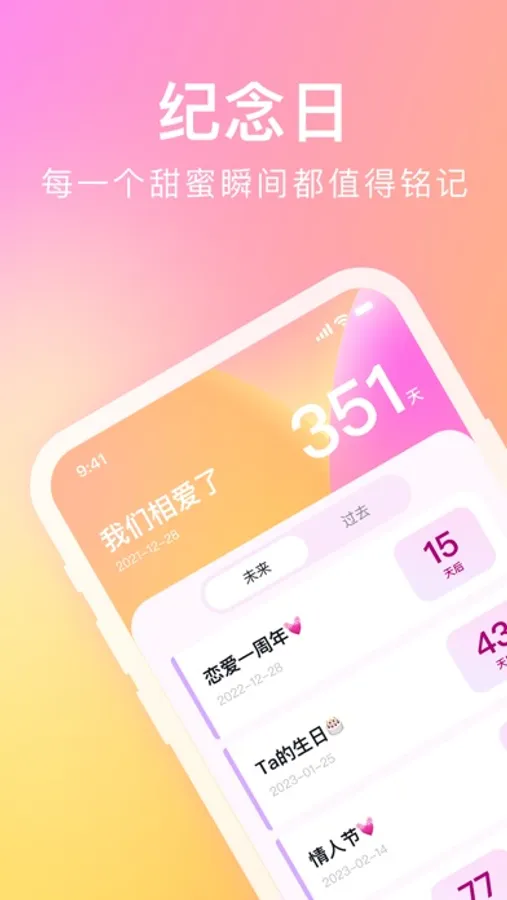 ▸纪念日:不错过每个值得纪念的日子,例如相恋100天、恋爱一周年、520天、1314天
