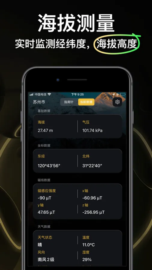 当然,除此之外,我们好有很多丰富的功能,您还可以通过该软件获取当前位置的经纬度信息、天气信息、磁场信息,以及海拔和气压。