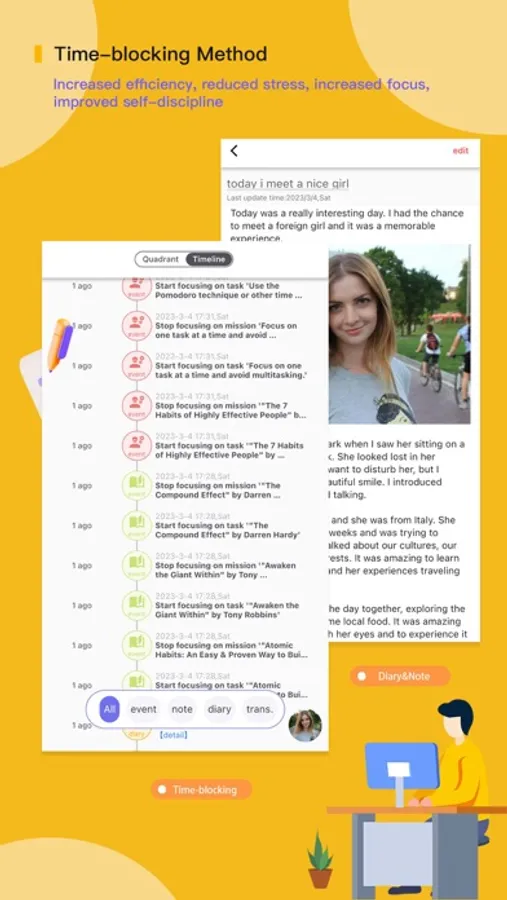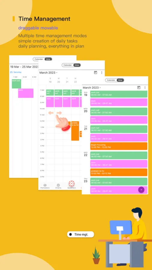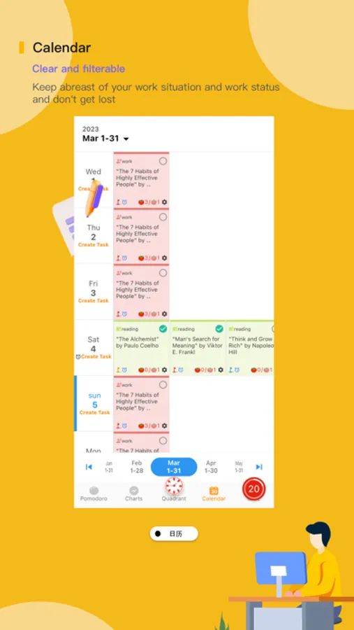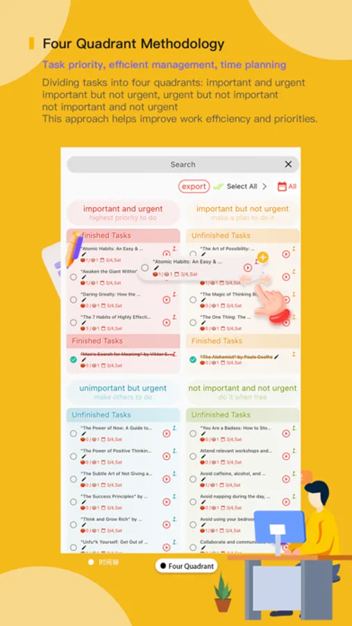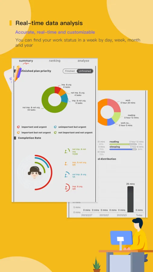 To-do list, tomato clock, four quadrants, time axis&time line, work data analysis and display
