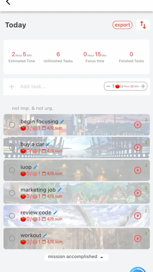 The key of tomato working method is planning, tracking, recording, processing and visualization. In the planning stage, tasks are listed in the "To Do Today" list according to priority. This allows users to estimate the workload of each task. When each tomato session is over, the results will be recorded to improve the participants' sense of achievement and provide raw data for future self-observation and improvement.