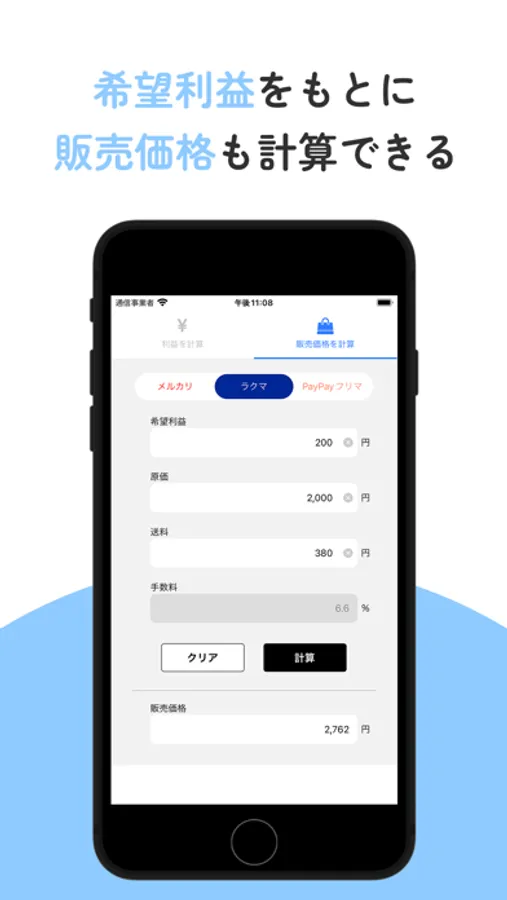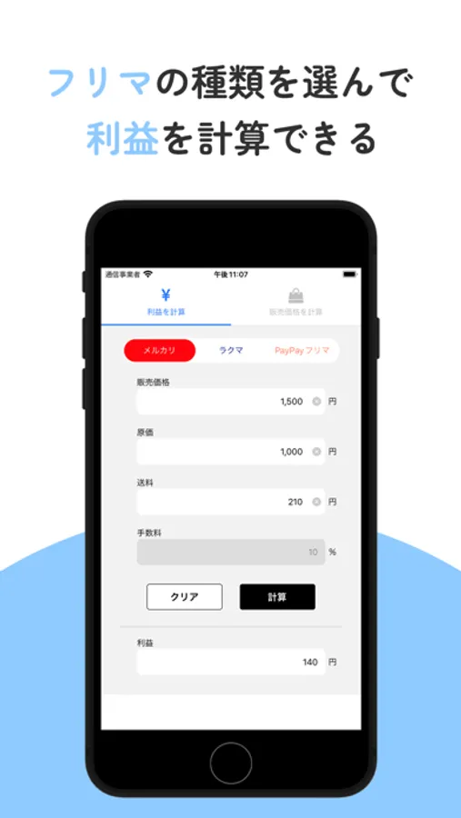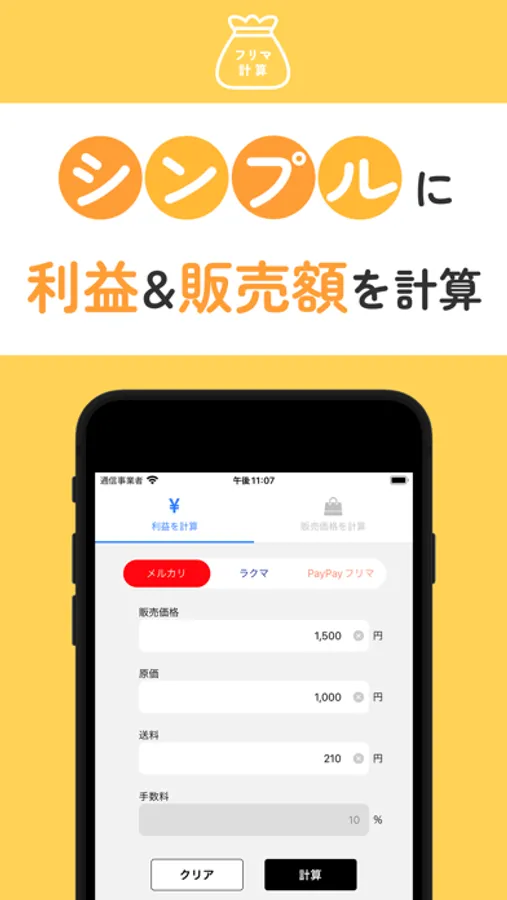 フリマ(メルカリ・楽天ラクマ・PayPayフリマ)での利益と販売価格を計算できるアプリです。