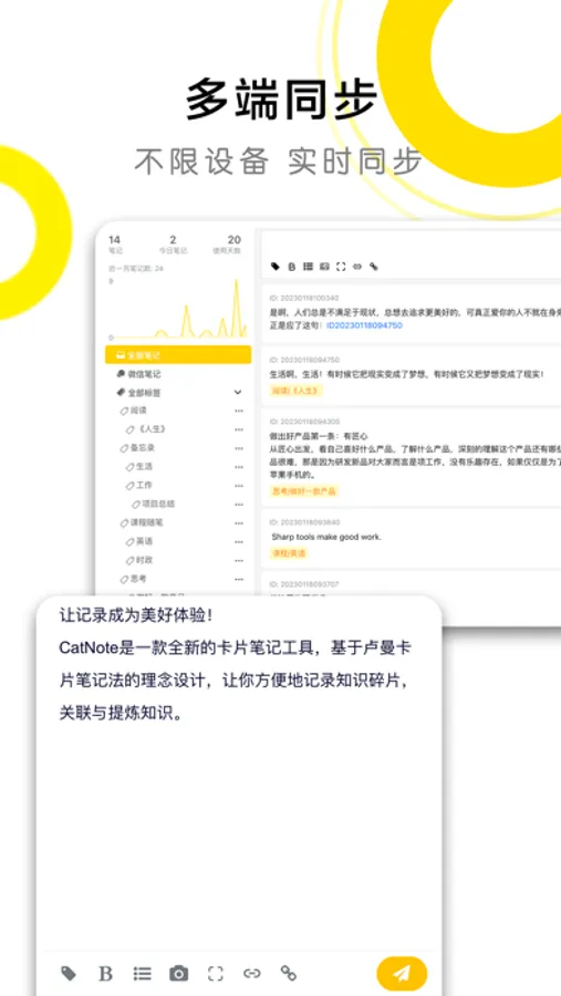 【多端同步】支持永久免费的多端多平台云同步,不限设备登录数量,自由选择最便捷的记录方式。