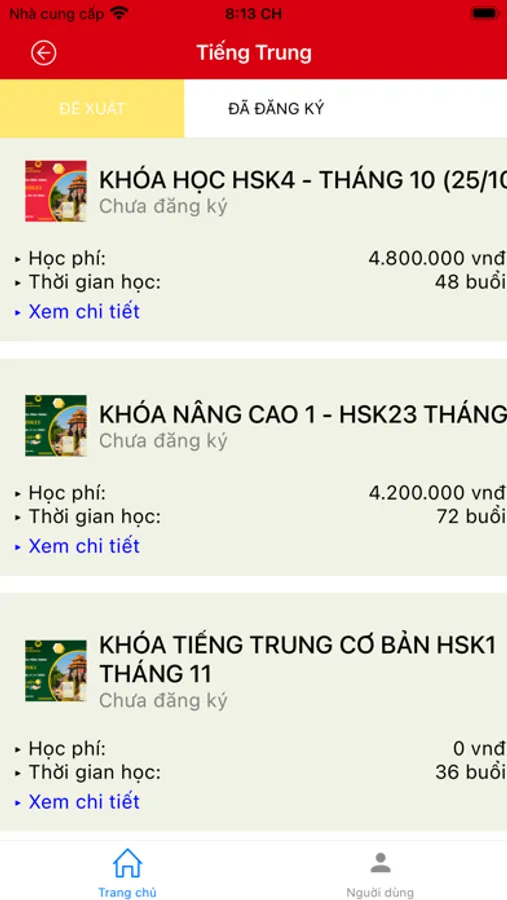 - Người dùng đăng ký khóa học qua link đăng ký trong ứng dụng, và được phê duyệt trực tiếp tại trung tâm.