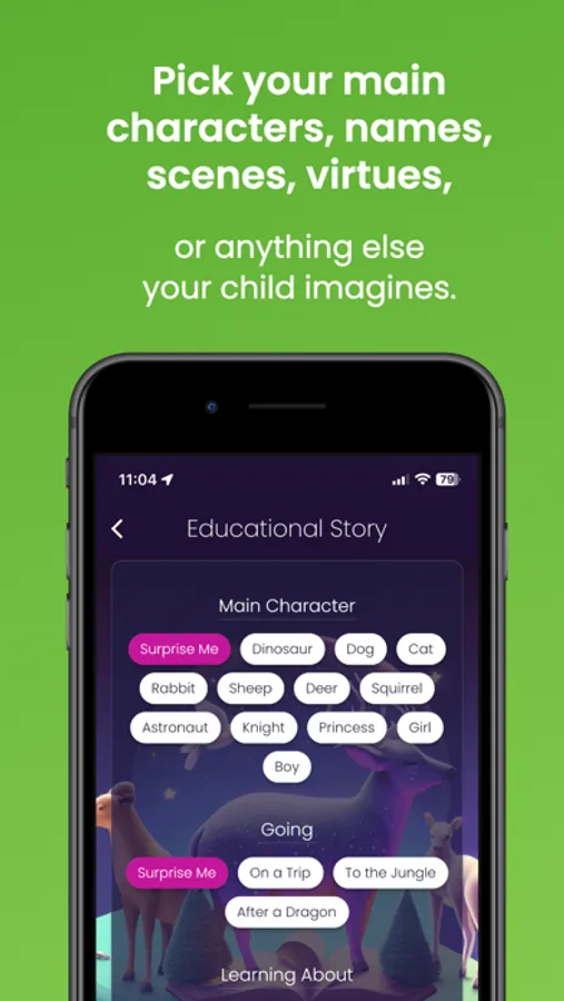 First, you and your child choose the main characters and the virtues you'd like to focus on in your story. From astronauts, to knights, to dinosaurs, Magic Story has a wide range of characters to choose from, each one ready to inspire your child